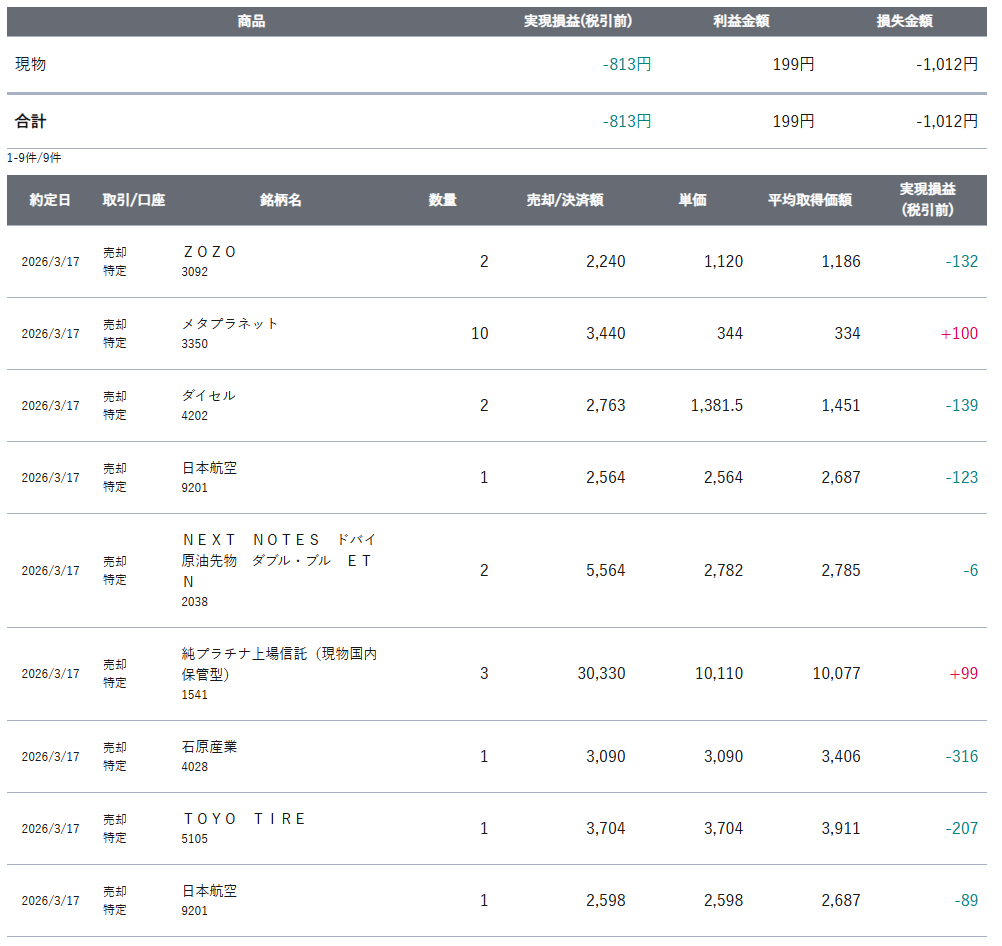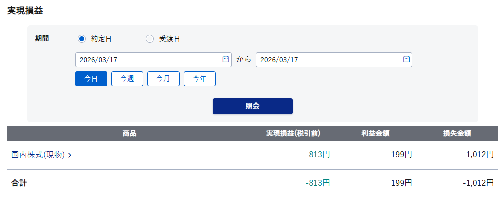 今日の実現損益は-813円でした。S株をちびちびと損切りしてます。